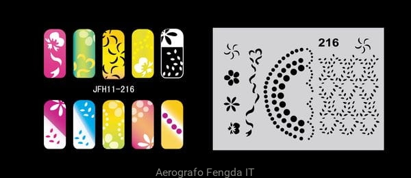 Disegno (modello) per le unghie Fengda (nail stencil) è un ottimo aiuto per l'arte aerografo unghie, o nail design. Il modello è lavabile e riutilizzabile. Il modello è a forma di cerchio e contiene un gran numero di diversi disegni, che possono essere combinati per creare un aspetto unico di unghie.