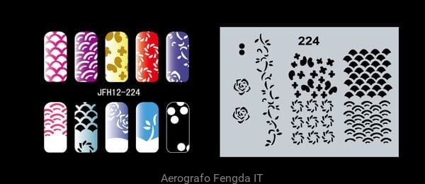 Disegno (modello) per le unghie Fengda (nail stencil) è un ottimo aiuto per l'arte aerografo unghie, o nail design. Il modello è lavabile e riutilizzabile. Il modello è a forma di cerchio e contiene un gran numero di diversi disegni, che possono essere combinati per creare un aspetto unico di unghie.