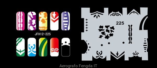 Disegno (modello) per le unghie Fengda (nail stencil) è un ottimo aiuto per l'arte aerografo unghie, o nail design. Il modello è lavabile e riutilizzabile. Il modello è a forma di cerchio e contiene un gran numero di diversi disegni, che possono essere combinati per creare un aspetto unico di unghie.