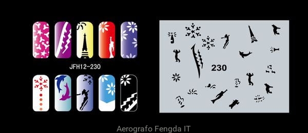 Disegno (modello) per le unghie Fengda (nail stencil) è un ottimo aiuto per l'arte aerografo unghie, o nail design. Il modello è lavabile e riutilizzabile. Il modello è a forma di cerchio e contiene un gran numero di diversi disegni, che possono essere combinati per creare un aspetto unico di unghie.