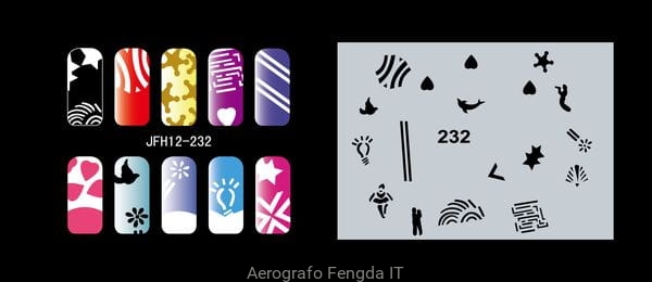 Disegno (modello) per le unghie Fengda (nail stencil) è un ottimo aiuto per l'arte aerografo unghie, o nail design. Il modello è lavabile e riutilizzabile. Il modello è a forma di cerchio e contiene un gran numero di diversi disegni, che possono essere combinati per creare un aspetto unico di unghie.