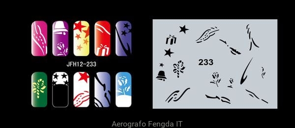 Disegno (modello) per le unghie Fengda (nail stencil) è un ottimo aiuto per l'arte aerografo unghie, o nail design. Il modello è lavabile e riutilizzabile. Il modello è a forma di cerchio e contiene un gran numero di diversi disegni, che possono essere combinati per creare un aspetto unico di unghie.