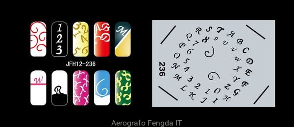 Disegno (modello) per le unghie Fengda (nail stencil) è un ottimo aiuto per l'arte aerografo unghie, o nail design. Il modello è lavabile e riutilizzabile. Il modello è a forma di cerchio e contiene un gran numero di diversi disegni, che possono essere combinati per creare un aspetto unico di unghie.