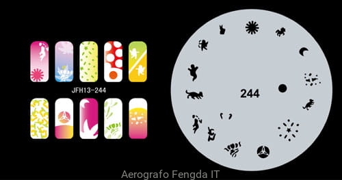 Disegno (modello) per le unghie Fengda (nail stencil) è un ottimo aiuto per l'arte aerografo unghie, o nail design. Il modello è lavabile e riutilizzabile. Il modello è a forma di cerchio e contiene un gran numero di diversi disegni, che possono essere combinati per creare un aspetto unico di unghie.