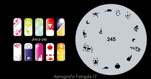 Disegno (modello) per le unghie Fengda (nail stencil) è un ottimo aiuto per l'arte aerografo unghie, o nail design. Il modello è lavabile e riutilizzabile. Il modello è a forma di cerchio e contiene un gran numero di diversi disegni, che possono essere combinati per creare un aspetto unico di unghie.
