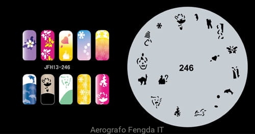 Disegno (modello) per le unghie Fengda (nail stencil) è un ottimo aiuto per l'arte aerografo unghie, o nail design. Il modello è lavabile e riutilizzabile. Il modello è a forma di cerchio e contiene un gran numero di diversi disegni, che possono essere combinati per creare un aspetto unico di unghie.