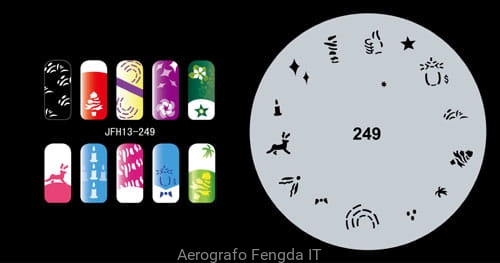 Disegno (modello) per le unghie Fengda (nail stencil) è un ottimo aiuto per l'arte aerografo unghie, o nail design. Il modello è lavabile e riutilizzabile. Il modello è a forma di cerchio e contiene un gran numero di diversi disegni, che possono essere combinati per creare un aspetto unico di unghie.