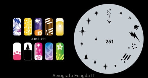 Disegno (modello) per le unghie Fengda (nail stencil) è un ottimo aiuto per l'arte aerografo unghie, o nail design. Il modello è lavabile e riutilizzabile. Il modello è a forma di cerchio e contiene un gran numero di diversi disegni, che possono essere combinati per creare un aspetto unico di unghie.