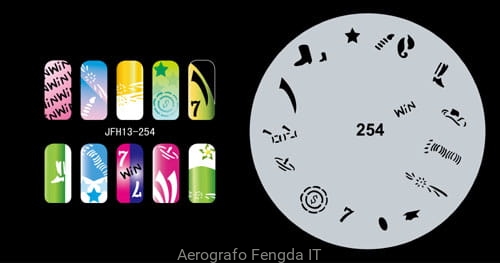 Disegno (modello) per le unghie Fengda (nail stencil) è un ottimo aiuto per l'arte aerografo unghie, o nail design. Il modello è lavabile e riutilizzabile. Il modello è a forma di cerchio e contiene un gran numero di diversi disegni, che possono essere combinati per creare un aspetto unico di unghie.