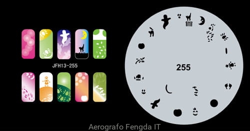 Disegno (modello) per le unghie Fengda (nail stencil) è un ottimo aiuto per l'arte aerografo unghie, o nail design. Il modello è lavabile e riutilizzabile. Il modello è a forma di cerchio e contiene un gran numero di diversi disegni, che possono essere combinati per creare un aspetto unico di unghie.