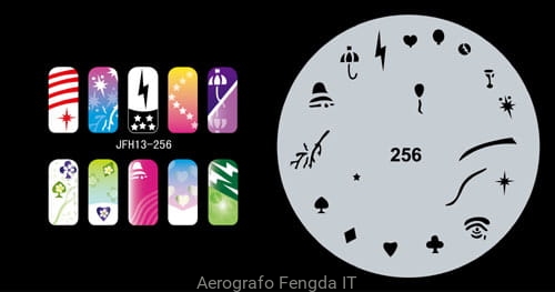 Disegno (modello) per le unghie Fengda (nail stencil) è un ottimo aiuto per l'arte aerografo unghie, o nail design. Il modello è lavabile e riutilizzabile. Il modello è a forma di cerchio e contiene un gran numero di diversi disegni, che possono essere combinati per creare un aspetto unico di unghie.