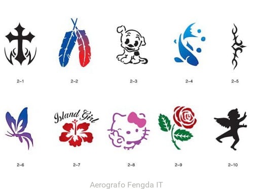 Il disegno (modello) per i tatuaggi brillantini (glitter tatuaggio), può essere benissimo utilizzato per tatuaggio aerografo (airbrush tattoo). Il kit include modelli con numero di catalogo GTS 02-01 fino a 02-10.