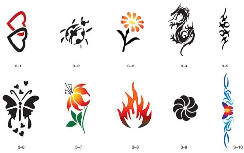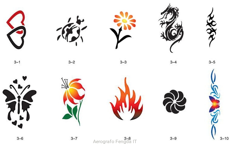 Il disegno (modello) per i tatuaggi brillantini (glitter tatuaggio), può essere benissimo utilizzato per tatuaggio aerografo (airbrush tattoo). Il kit include modelli con numero di catalogo GTS 03-01 fino a 03-10.