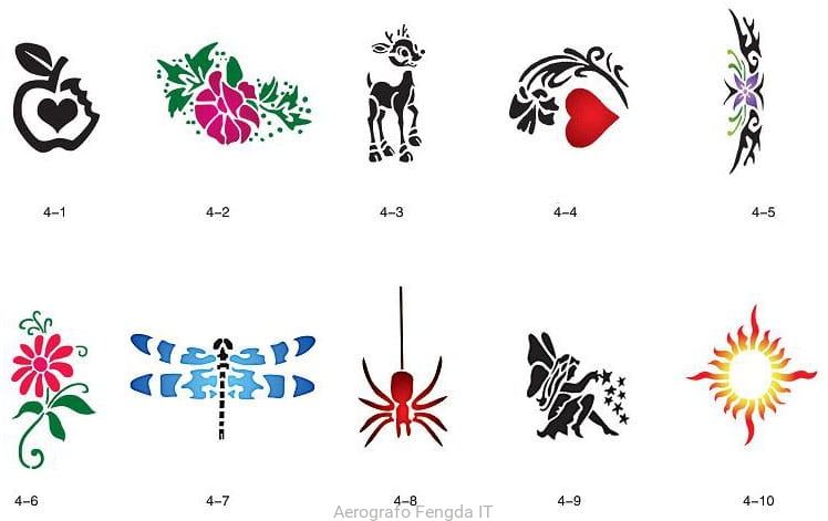 Il disegno (modello) per i tatuaggi brillantini (glitter tatuaggio), può essere benissimo utilizzato per tatuaggio aerografo (airbrush tattoo). Il kit include modelli con numero di catalogo GTS 04-01 fino a 04-10.