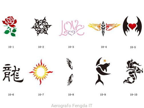 Il disegno (modello) per i tatuaggi brillantini (glitter tatuaggio), può essere benissimo utilizzato per tatuaggio aerografo (airbrush tattoo). Il kit include modelli con numero di catalogo GTS 10-01 fino a 10-10.