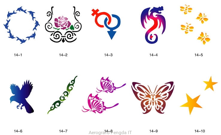 Il disegno (modello) per i tatuaggi brillantini (glitter tatuaggio), può essere benissimo utilizzato per tatuaggio aerografo (airbrush tattoo). Il kit include modelli con numero di catalogo GTS 14-01 fino a 14-10.