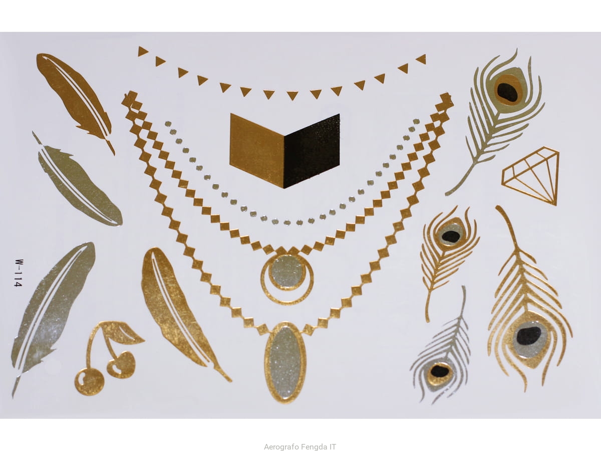 Adesivi tatuaggi temporanei d´oro e d´argento, impermeabili, ispirati a gioielli (bracciali, collane, anelli, giarrettiere, motivi indiani, africani, egiziani e geometrici), che durano 3-5 giorni da applicare e rimuovere seguendo questa semplice guida: