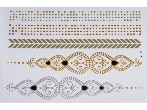 Złote a srebrne tymczasowe wodoodporne tatuażowe naklejki inspirowane biżuteria (bransoletkami, naszyjnikami, pierścionkami, indyjskie, afrykańskie, egipskie, motywy geometryczne i inne), tatuaż wytrzyma 3-5 dni, dla aplikacji i usunięcia przygotowaliśmy dla Was poradnik: