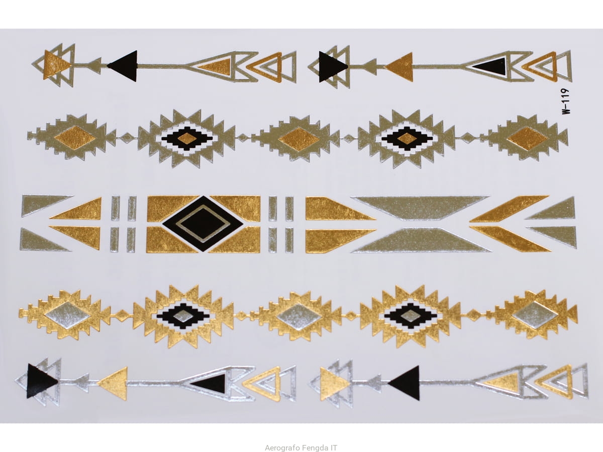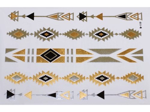 Złote a srebrne tymczasowe wodoodporne tatuażowe naklejki inspirowane biżuteria (bransoletkami, naszyjnikami, pierścionkami, indyjskie, afrykańskie, egipskie, motywy geometryczne i inne), tatuaż wytrzyma 3-5 dni, dla aplikacji i usunięcia przygotowaliśmy dla Was poradnik: