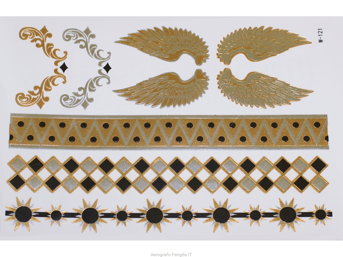 Adesivi tatuaggi temporanei d´oro e d´argento, impermeabili, ispirati a gioielli (bracciali, collane, anelli, giarrettiere, motivi indiani, africani, egiziani e geometrici), che durano 3-5 giorni da applicare e rimuovere seguendo questa semplice guida: