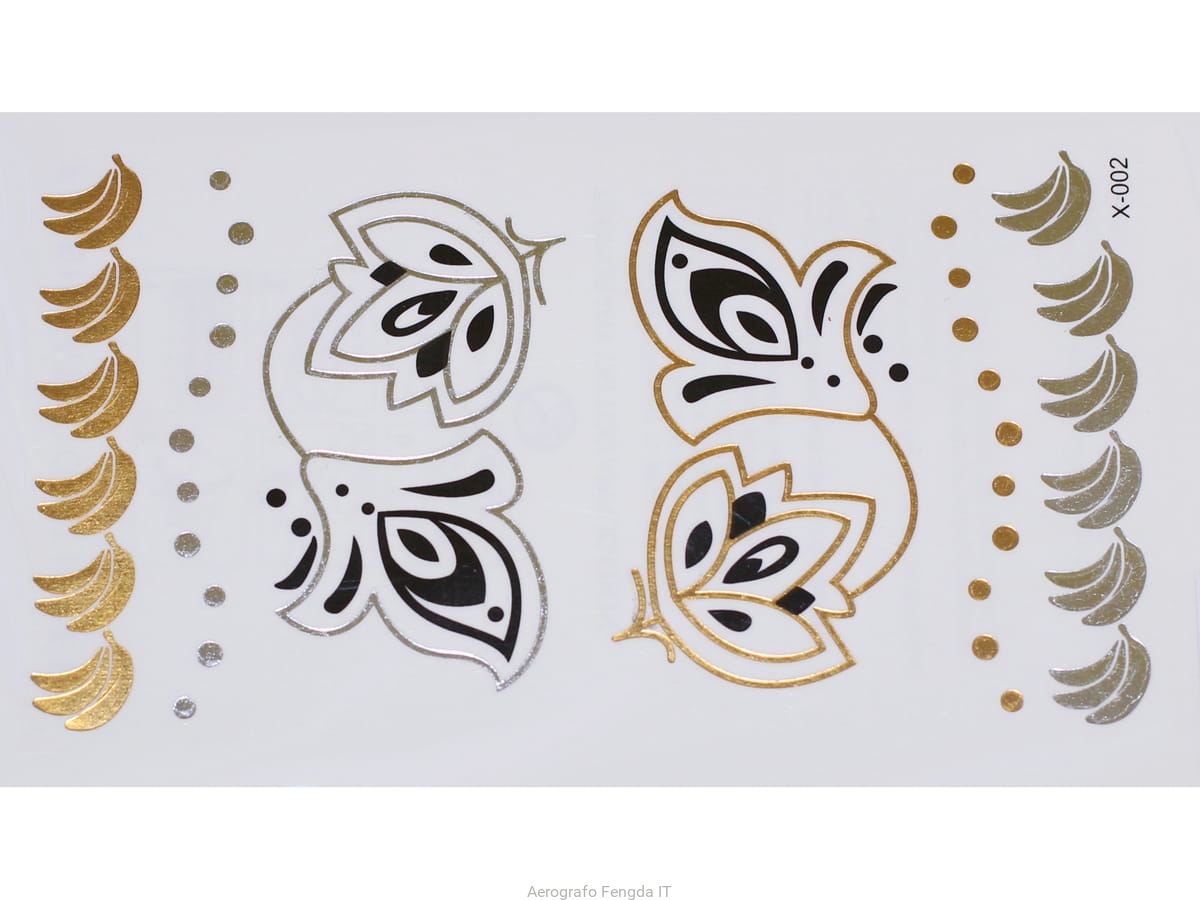 Adesivi tatuaggi temporanei d´oro e d´argento, impermeabili, ispirati a gioielli (bracciali, collane, anelli, giarrettiere, motivi indiani, africani, egiziani e geometrici), che durano 3-5 giorni da applicare e rimuovere seguendo questa semplice guida: