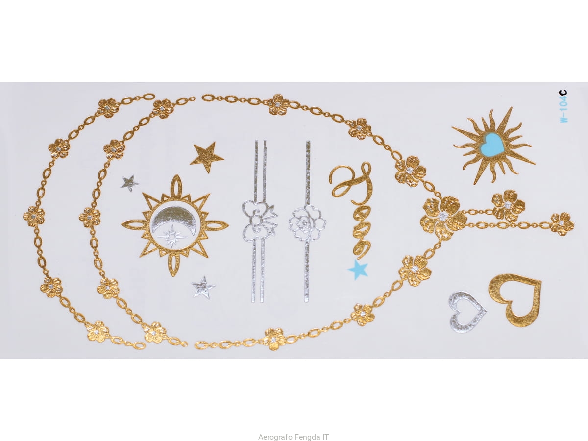 Adesivi tatuaggi temporanei d´oro e d´argento, impermeabili, ispirati a gioielli (bracciali, collane, anelli, giarrettiere, motivi indiani, africani, egiziani e geometrici), che durano 3-5 giorni da applicare e rimuovere seguendo questa semplice guida: