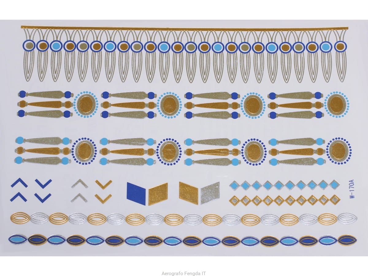 Zlaté a stříbrné dočasné nalepovací voděodolné tetovací obtisky inspirované šperky (náramky, náhrdelníky, prsteny, podvazky, indické, africké, egyptské, geometrické a jiné motivy), které vydrží 3-5 dní se aplikují a odstraní podle tohoto jednoduchého návodu: