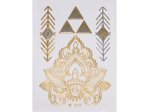 Złote a srebrne tymczasowe wodoodporne tatuażowe naklejki inspirowane biżuteria (bransoletkami, naszyjnikami, pierścionkami, indyjskie, afrykańskie, egipskie, motywy geometryczne i inne), tatuaż wytrzyma 3-5 dni, dla aplikacji i usunięcia przygotowaliśmy dla Was poradnik: