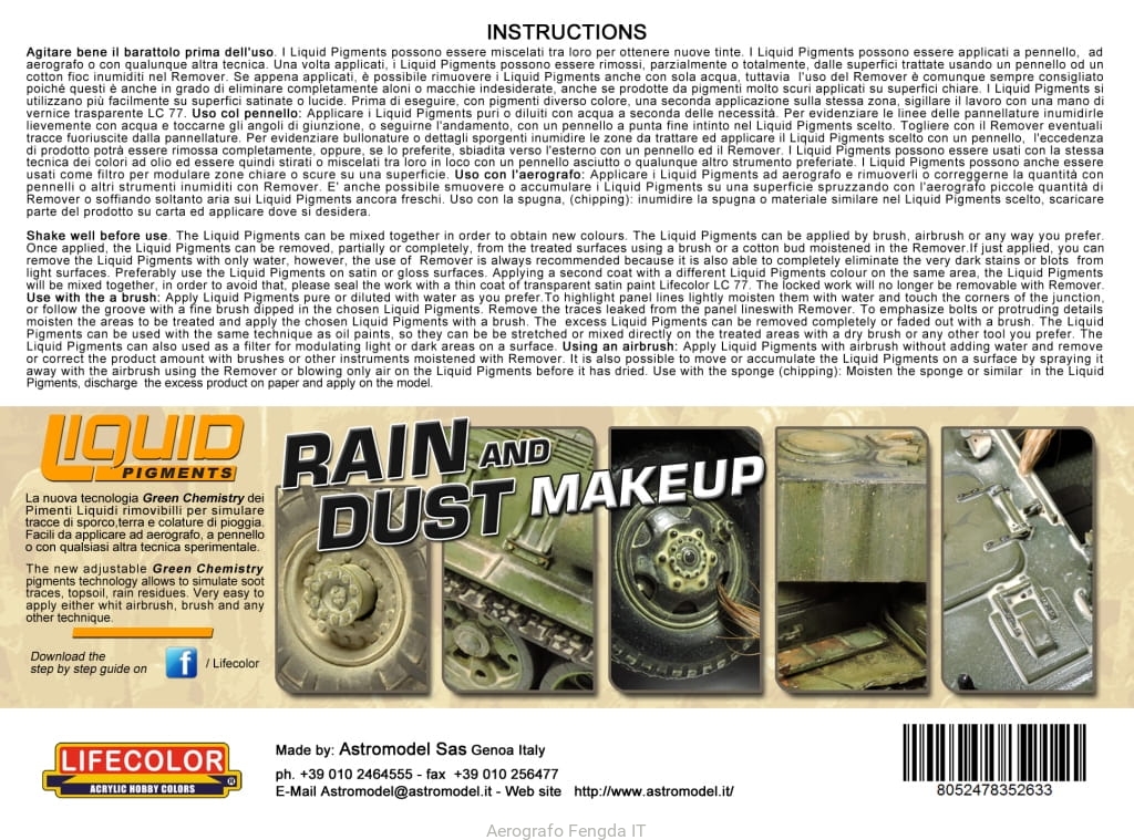 Per la creazione di sporco, polvere, fango, goccie. Tracce di polvere rotolare giù. Applicazione é facile con aerografo, pennello, o altra tecnica.