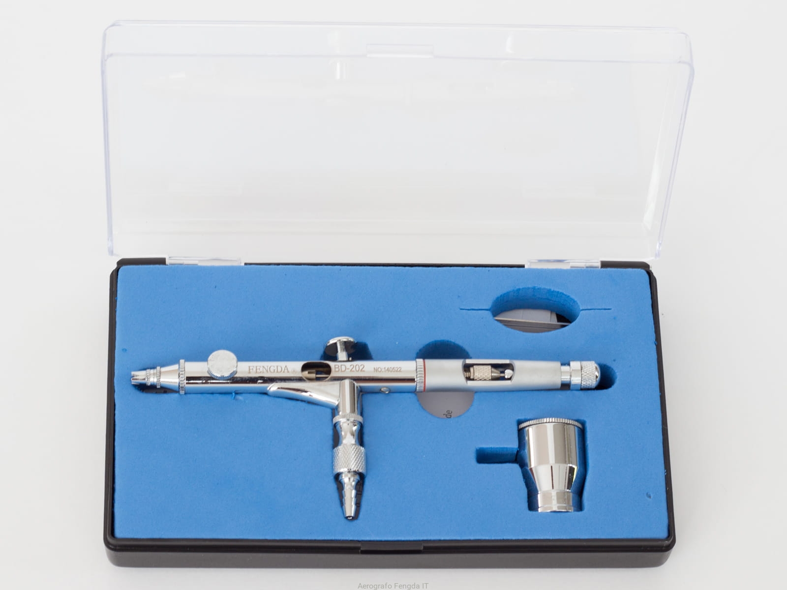 Pistola a spruzzo aerografo Fengda BD-202 viene fornita in una scatola di plastica con pratico coperchio trasparente, imbottitura in schiuma blu. Pistola a spruzzo aerografo Fengda è molto popolare tra gli utenti, grazie alla sua perfezione, lunga durata e basso costo.