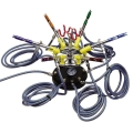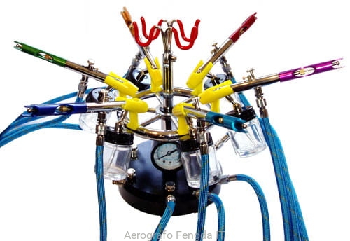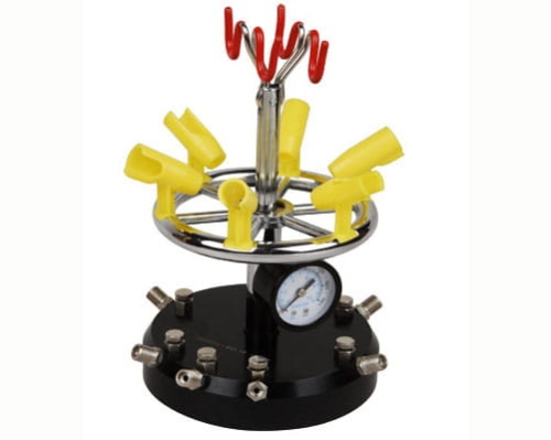 This airbrush stand will hold up to 8 airbrushes and incorporates6 branch air valves enabling flow adjustment to each airbrush. It also has a 360 degrees rotary action, and air pressure gauge built in showing the line pressure.The top holder swivels for easy access to all airbrushes, whilst the base features rubber suckers for a firm grip on you smooth work surface.